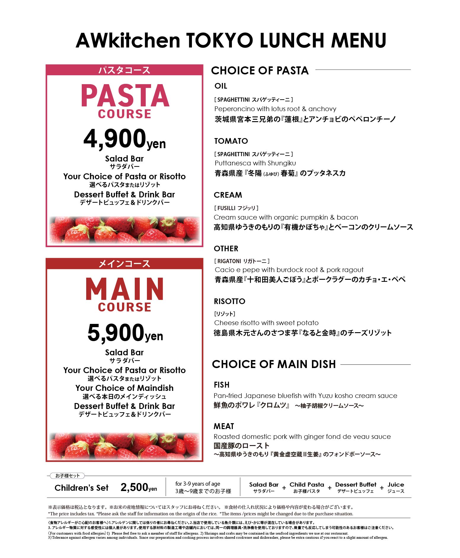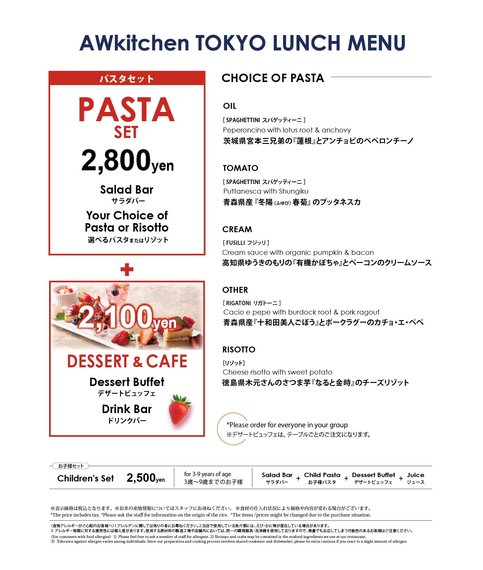 “PASTA HOUSE”のコンセプトはそのままに、開放感あふれる空間で、AWkitchenならではのフレンドリーなサービスと、心も身体も喜ぶ一皿をお届けします。柔らかな陽光が差し込むランチタイムは、色鮮やかな野菜をふんだんに使った前菜とデザートをブッフェスタイルでご用意。そして夜は、落ち着きと洗練が共存する空間へ。落ち着いた雰囲気に包まれるなか、デートやビジネスディナーなど、ラグジュアリーなひと時をお過ごしいただけます。r>